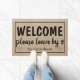 This funny doormat features the sentence "Welcome Please Leave by 9" on rustic faux burlap. Personalise it by adding your family name. Perfect funny unique modern housewarming or new homeowners gift.