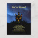 Humourous postcard shows a black haunted house with windows lit on a stormy night with thunderstorm and lightning. It shows "We've Moved" at the top and contact information at the bottom, in yellow. The text is customisable to personalise it to suit your needs.