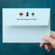 Envelope that matches a separate change of address card. Envelope shows "The Smith Family Has Moved" on the flap below a vampire, witch, and green monster. Customise the text. A haunted house full of Halloween characters, including a vampire, witch, ghost, devil, mummy, grim reaper, monster, and pumpkins displays inside the envelope. The background is light blue.