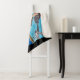 This Sherpa fleece blanket has a funny witch in a bathing suit with a cape on her way to the beach flying over the ocean next to white seagulls with her cat hanging on the end of the broom in a wavy black frame.