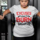 Do you love working out at the gym to burn calories? If so, this Excuses Don't Burn Calories gym T-shirt is perfect for you. It's a funny and motivational exercise tee that's great for your next exercise class, weightlifting workout, or for anyone trying to lose weight and eat a healthy diet. The inspirational quote on the shirt is a great reminder that a healthy diet and exercise, or a weightlifting workout at the gym, will burn the calories you need to lose weight. It's a great workout gift for weightlifters, exercise enthusiasts, or even someone who's just starting a fitness program.