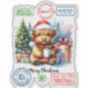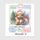 A cute, cartoon highland cow wearing a Santa hat and a red and black plaid scarf sits with a cup of hot cocoa next to a stack of wrapped gifts. A Christmas tree with colourful ornaments sits in the background.