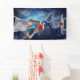 This inspiring artwork captures the drive of a future all-star athlete practicing hoops under a star-filled, moonlit sky. From the perspective of the ground, we see the young player in a white shirt, fully focused and mid-air, reaching for a layup to take the shot through the hoop. The rich, saturated colours bring an otherworldly, dream-like quality to the scene, as if the night sky itself is cheering on this rising star.