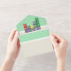 This science-themed all-in-one invitation with removable RSVP card features a background of paramecium in pale green on a spring green base. Layered on top of this pattern are panels of cream with a white line to give the impression of baseboard at the bottom of a wall providing a base for sample text on the interior that can be customised for your event and blank space on the exterior that can be used for addressing the cards to the recipient and the returnable section with the appropriate return address. Finally a biology themed set of wooden alphabet blocks featuring the nucleic acid sequence that makes up human telomeres sits on the flap above the text and on the back when closed. Mixed around the bases are blocks with a variety of microscopic and macroscopic icons to showcase some of the concepts and fields associated with biology, including a flower, a Petri dish, a bacteriophage, and a neuron. Be sure to check out the full Future Biologist's Blocks collection for more great gifts and products for a baby shower or the little one in your life.