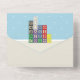 This science-themed all-in-one invitation with removable RSVP card features a background of Bohr model atoms in pale blue on a sky blue base. Layered on top of this pattern are panels of cream with a white line to give the impression of baseboard at the bottom of a wall providing a base for sample text on the interior that can be customised for your event and blank space on the exterior that can be used for addressing the cards to the recipient and the returnable section with the appropriate return address. Finally a chemistry themed set of wooden alphabet blocks featuring the chemical formula for oxytocin, the "cuddle hormone" sits on the flap above the text and on the back when closed. Mixed around the elements of the formula are blocks with tools and structures to showcase some of the variety of concepts and fields associated with chemistry, including test tubes, a flask, molecular structures, and an electron orbital. Be sure to check out the full Future Chemist's Blocks collection for more great gifts and products for a baby shower or the little one in your life.