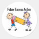 A stick figure boy and girl carry a huge yellow pencil and text reads "Future Famous Author", a cute design on T-shirts, mugs, cards, tote bags, and other items perfect for the person who loves writing!