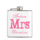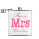 Custom Future Mrs pink wedding drink flask for bride to be with elegant vintage script text. Customisable pink and white colour. Cool wedding / bachelorette party gift idea for bride and bridesmaids. Personalise it. Alcohol / Drinking present. Custom background colour.