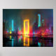 Futuristic cityscape with towering buildings illuminated in vibrant neon colours, including blues, pinks, and yellows. A large, rectangular, glowing yellow structure dominates the centre, with two silhouetted figures standing near it. The city's lights reflect on a dark, wet surface in the foreground, creating a mirrored effect.