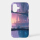 Futuristic cityscape with towering structures and interconnected platforms, reflecting in a body of water. The color palette is dominated by blues and purples, with hints of orange and pink from the setting sun. The city is illuminated with numerous lights, creating a vibrant and dynamic atmosphere.