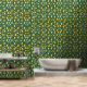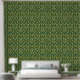 A unique pattern of futuristic train pod shapes intertwined with abstract trees in soft yellow and orange hues on a green background. This playful and modern design creates a whimsical, futuristic landscape, perfect for fans of imaginative and creative artwork.