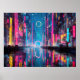A vibrant cityscape showcases towering buildings adorned with bright neon lights. The reflection in the water adds to the surreal atmosphere.