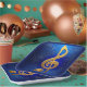 The G or Treble clef in gold, with a sprinkling of tiny notes around it, image created with artificial intelligence. Express the musical essence of you with paper plates awash with musical notation.