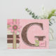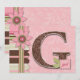 G monogram with girl tag and dot ribbon and scalloped trim binding edge with novelty trims and applique-look flower with button.