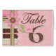 Stripe scalloped trim binding edge with 3D-look number tag and flower with button eyes table card.