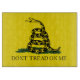 This design features the Gadsden Flag, a historical American flag that contains an illustration of a timber rattlesnake raising itself from the grass in an aggressive posture; there is a bright yellow background that covers the flag. The text says "Don't tread on me" in capital lettering.