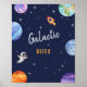 A cute and customisable outer space themed birthday sign featuring watercolor illustrations of the galaxy, stars, planets, a rocket ship and, an astronaut. Perfect for children who love a blast of a galactic adventure on their birthday.