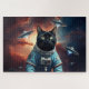 A captivating image of a black cat dressed as an astronaut, gazing confidently into the cosmos. Surrounded by flying saucers and a vibrant nebula, the cat embodies a sense of adventure and mystery.