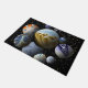 Beautifully designed fractal planets surrounded by stars suspended into space, in main colours of gold and blue.