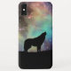 Galactic wolf features a silhouette of a in a forest howling at the stars above.