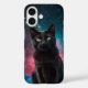 A mystical black cat perched on a moon in a vibrant galaxy, perfect for dreamlike and cosmic designs.