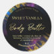 A vibrant pink blue and purple galaxy on black with a touch of gold glitter. Body butter packaging labels for your body butter.