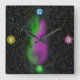 This vibrant square wall clock features a mesmerising galaxy-inspired design, with a swirling nebula of green and purple hues set against a star-speckled backdrop. The bold, colourful number markers (12, 3, 6, and 9) pop against the cosmic canvas, making it both functional and visually captivating.