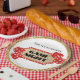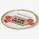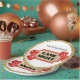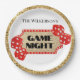These custom party plates feature a glamourous game night theme on a white background. A glitter marquee sign is placed in the centre, with a gold glitter background and red border with lights. Red glitter playing dice are placed on either side of the sign A gold sequins border frames the plate.