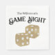 These custom party napkins feature a Game Night theme. An image of playing dice are printed in the centre in a gold glitter design. The phrase "Game Night" is printed above the dice with a sample family name. You can personalise the napkins to include your own custom name or text.