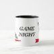 Here's a mug for the hockey fan. A 'game night' coffee mug... hockey sticks, hockey pucks and a red emblem. The saying can be changed if so desired.