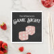 These custom party napkins feature a Game Night theme. An image of playing dice are printed in the centre in a pink glitter design over a black background. The phrase "Game Night" is printed above the dice with a sample family name. You can personalise the napkins to include your own custom name or text.