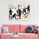 Silhouetted basketball players are dynamically posed, each interacting with multiple basketballs across a vibrant, abstract sports court.