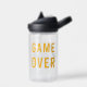 This graphic boldly captures the phrase "GAME OVER" set against a vibrant blue background, intertwined with an abstract, circuit board-inspired design in white. The design's high-contrast, bold yellow letters grab attention, while the intricate circuit lines evoke the essence of digital technology and gaming. This visual interplay between text and circuitry not only appeals to gamers but also creatively symbolises the end of a digital journey or game. This image would be perfect for gaming related content, apparel, or even as a stylish poster for a gaming room.