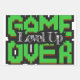 Game Over is depicted in bold, pixelated lettering, with the words “Level Up” creatively superimposed on it in an ornate script at its centre and a sun shining behind it at the top. The design combines playful and bold elements reminiscent of classic video game graphics..