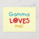 Gamma Loves Me T-shirts, cards, stickers, bodysuits bags, and more with colourful red, yellow, and blue text and heart design. These Gamma Loves me apparel and gift items will make gamma smile!