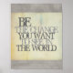 Gandhi quote be the change text is on a poster in a shabby chic style with a print of distressed grey and hand painted textures for the background for wall art decor in home or office.