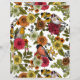 Hand-drawn garden birds- robin, goldfinch and bulfinch on bouquets of flowers and leaves- dahlias, chrysanthemums, calendula, coneflowers ivy and ferns