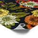 Hand-drawn garden birds- robin, goldfinch and bulfinch on bouquets of flowers and leaves- dahlias, chrysanthemums, calendula, coneflowers ivy and ferns