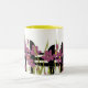Elevate your coffee or tea experience with this charming ceramic mug, meticulously designed with vibrant pink flowers featuring sunny yellow centres. Surrounded by lush green stems and leaves, the floral pattern is perfectly contrasted against a sleek black fence backdrop, making this mug a true statement piece. The interior boasts a bright yellow lining that not only complements the exterior design but also adds a cheerful pop of colour to your drinkware collection. Resting gracefully on a clean, white surface, this mug is not just a functional item but also a delightful artwork that brings a touch of nature into your home or office.
