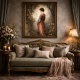 A Pre-Raphaelite lady in terracotta silk stands amid climbing roses. The composition balances structured drapery against wild garden elements.