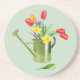 Sandstone coaster is shown with a cute water can of garden flowers print.