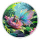 A tiny girl and a butterfly with iridescent wings perched on a giant flower in a lush jungle, accompanied by a colourful toucan. Large leaves and vibrant flowers surround them, creating a magical, whimsical scene. Digital Art