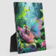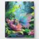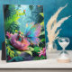 A tiny girl and a butterfly with iridescent wings perched on a giant flower in a lush jungle, accompanied by a colourful toucan. Large leaves and vibrant flowers surround them, creating a magical, whimsical scene. Digital Art