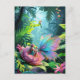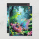 A tiny girl and a butterfly with iridescent wings perched on a giant flower in a lush jungle, accompanied by a colourful toucan. Large leaves and vibrant flowers surround them, creating a magical, whimsical scene. Digital Art