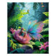 A tiny girl and a butterfly with iridescent wings perched on a giant flower in a lush jungle, accompanied by a colourful toucan. Large leaves and vibrant flowers surround them, creating a magical, whimsical scene. Digital Art