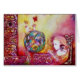 Colourful, whimsical,unique mixed media painting .Elegant design in gold sparkles,vibrant blue,green,red, pink,yellow,teal,purple colours with golden and silver foil, The theme concerns archetypes and mediaeval alchemic symbolism . This is a distilled vision from occidental and oriental collective imaginary searching remote images from the deep in the mysterious garden of the lost shadows.