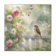 A soft watercolor scene captures a gentle songbird resting on a white garden fence surrounded by blooming pink roses, leafy vines, and warm morning light. The palette glows with pastel greens, blush pinks, creamy whites, and sunlit gold, creating a calm cottagecore atmosphere filled with quiet charm. Loose painterly brushstrokes and airy light give the artwork a whimsical folk feel, evoking peaceful garden mornings, vintage storybook illustrations, and romantic shabby chic beauty. AI generated artwork.