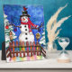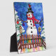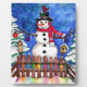 Original watercolor painting by Sandra Gale of a traditional snow man standing in front of a picket fence with glowing Christmas lights reflecting off the winter snow. Birds, bird houses, and Christmas ornaments all make this a classic Christmas scene that looks great on wrapping paper, holiday cards and more!