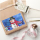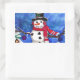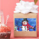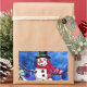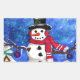 Original watercolor painting by Sandra Gale of a traditional snow man standing in front of a picket fence with glowing Christmas lights reflecting off the winter snow. Birds, bird houses, and Christmas ornaments all make this a classic Christmas scene that looks great on wrapping paper, holiday cards and more!