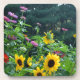 romantic old-fashion garden with daisies, cosmos and sunflowers - lined in the back with white pines.