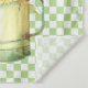 Pretty country / farmhouse design features a watercolor illustration of a garden watering can filled with a bouquet of sunflowers on mint green and white chequerboard background